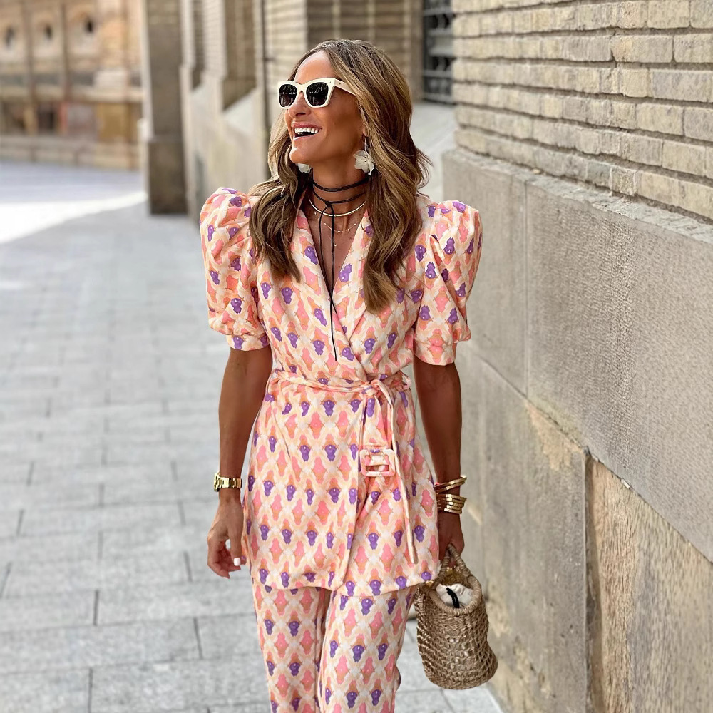 European And American Women's Lace Printing Two-piece Set Lantern Sleeve Trousers Slim-fitting Simple