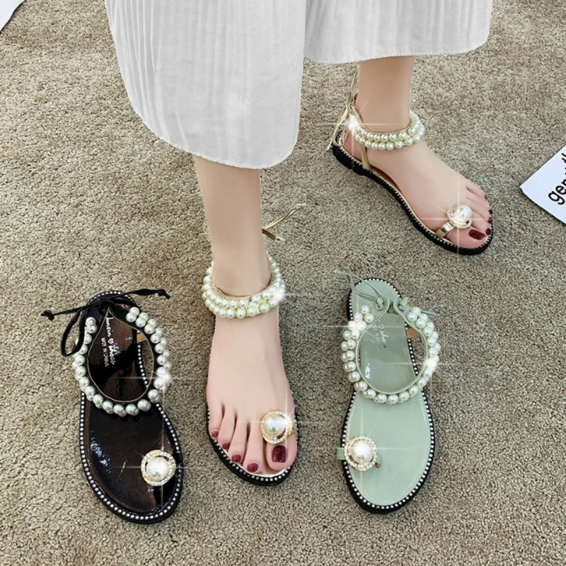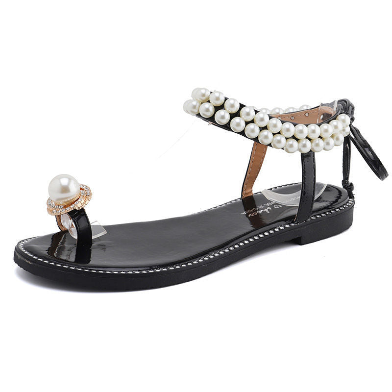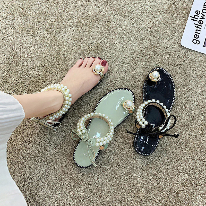 Net Red Female Student Korean New Pearl Flip-Flop Flat Sandals Female Summer Fairy Style Strap Black Flat Sandals